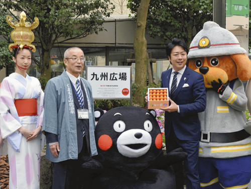 福岡市は市役所本庁舎隣の北側緑地を九州各地の情報を発信する「九州広場」と名付けた。7日、熊本県のPRキャラクター・くまモンなどが駆けつけ、看板の除幕式が行われた。