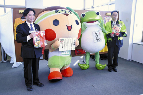 ケロ平は、平泉の柳之御所やなぎのごしょ遺跡から出土した木片に描かれた「平泉のカエル戯画」をモチーフにしたキャラクター。同行した岩手県県南広域振興局の久慈伸・観光労働商業課長が招待状を代読して、とちまるくんに手渡した。