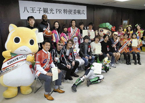 八王子市の観光をPRする八王子観光特使の委嘱式が24日、市役所で行われ、各界の人気者が石森孝志市長から委嘱状を受け取った。