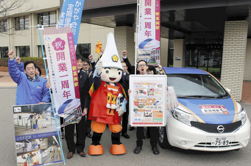 ご当地キャラクター「利長くん」らが北陸新幹線の「W7系」車両をイメージしたキャラバンカーに乗り、新高岡駅を「飛越能の玄関口」としてPRする。この日は、お笑いライブやごっつお鍋500食を無料で振る舞う開業1周年記念イベント(3月11~14日)のポスターやチラシを配布した。今後、能登地方や富山県西部、岐阜県飛騨地方の市町や商工会議所などを回る。