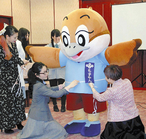 普段は半袖、半ズボン姿のもずやんだが、「衣装チェンジでさらなる人気アップを」と府が企画。大阪文化服装学院(大阪市)と上田安子服飾専門学校(同)の学生らが協力することになり、この日、胴回りや頭の大きさなどを測った。