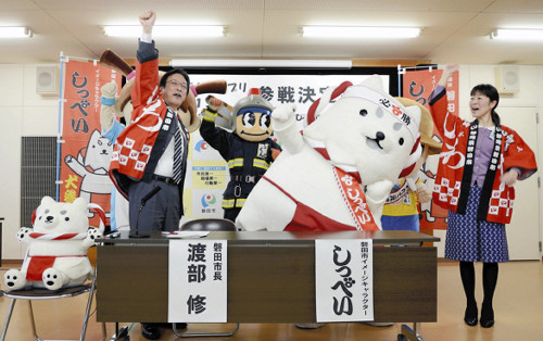 昨年のゆるキャラグランプリ(GP)で県勢で最高位の10位に入った磐田市のイメージキャラクター「しっぺい」が先月27日、磐田市役所で渡部修市長らと記者会見し、今年11月に浜松市内で開催されるゆるキャラGP2015に出馬を表明した。