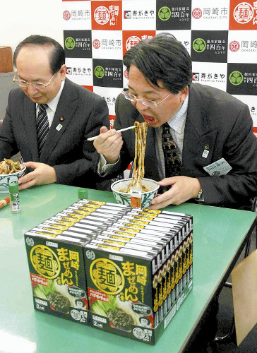【「岡崎まぜめんの素」を試食する内田市長(右)】