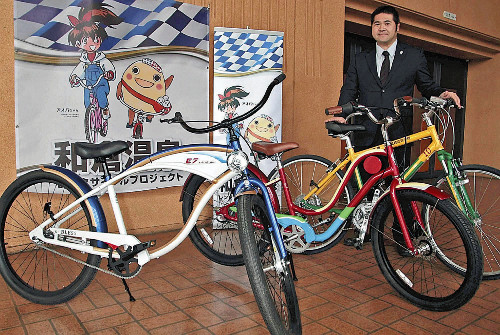 新たな貸自転車は、市街地走行向けの自転車「ビーチクルーザー」を、ブルーとゴールドのラインが目を引くカラーリングにした「かがやき号」(26インチ)と、和倉温泉のゆるキャラ「わくたまくん」をイメージしたかわいい塗装の「わくたまくん号」(24インチ)の2台。このほか、軽快な走りが楽しめる「クロスバイク」を、高校サッカー日本一になった星稜をイメージし、黄と緑色も鮮やかな「星稜号」(28インチ)もある。いずれも、1台ずつ職人が塗装した限定車。