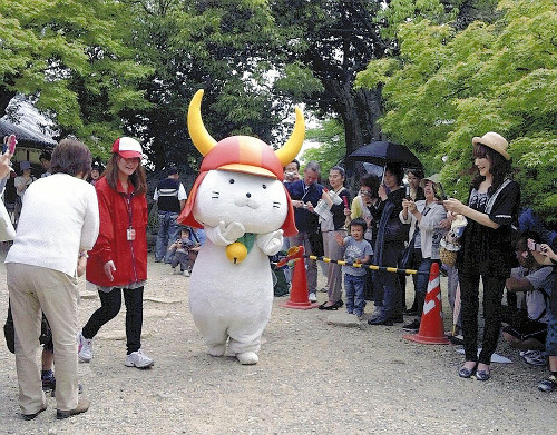 わずか2、3段の階段をのそのそと上がり、短い腕で刀や旗を振ってポーズをとるひこにゃん……。その一挙手一投足に皆の口元が緩む。