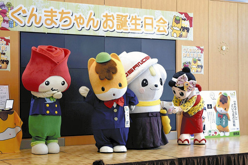 昨年11月の「ゆるキャラグランプリ2014」でグランプリとなった県のマスコット・ぐんまちゃんの誕生日会が22日、県庁で開かれ、約1000人のファンが参加した。2013年グランプリの「さのまる」(栃木県佐野市)ら、ゆるキャラ仲間たちも祝福に駆けつけた。