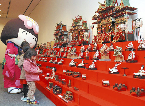 きらびやかな御殿にひな人形を飾った「御殿飾り」、2体の人形をペアにして飾った「親王飾り」など多彩なひな人形がそろい、華やかな雰囲気を醸し出している。知多市の観光をPRする公認キャラクター「梅子」も来館し、子供たちと一緒にひな人形を楽しむシーンも見られた。