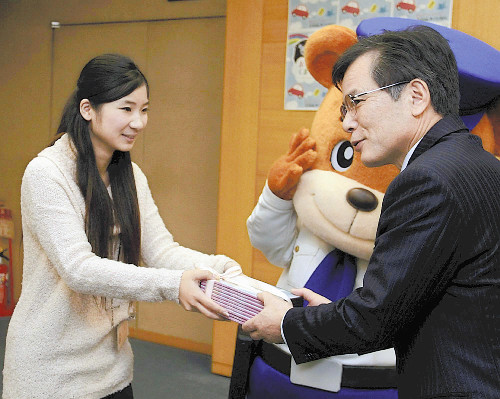 県警で動画を収録したDVDの贈呈式が行われ、木庭強・交通部長は「多くの県民に見てもらい、悲惨な事故を1件でも減らしたい」と述べた。同大4年の岩下明日香さん(21)は「普段意識しない交通ルールを親しみやすく理解してもらうことを意識した。多くの人に気軽に視聴してほしい」と話していた。