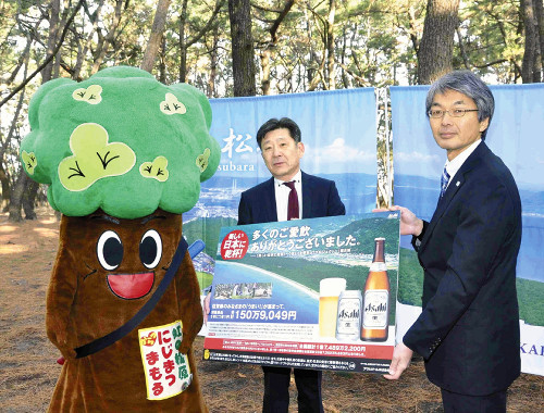アサヒビールは1日、国の特別名勝「虹の松原」(唐津市)の保全費用として、約150万円を県に寄付した。同社が主力商品「スーパードライ」の売り上げ1本につき、1円を寄付する取り組みの一環。