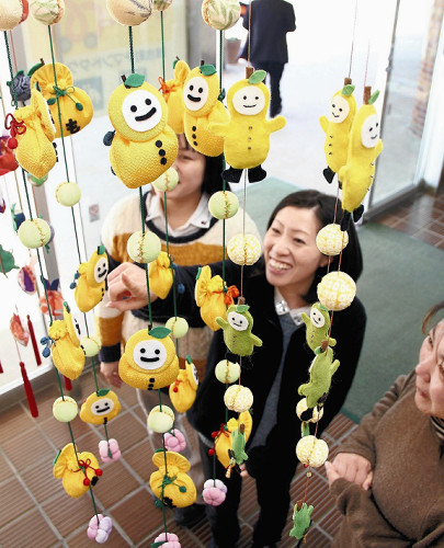 町内のつるし雛愛好会「布の会」(小森千代子会長)のメンバーが制作した。フェルトの全身ゆずもに加え、袋に顔をつけた巾着ゆずものつるし雛が来庁者を出迎える。