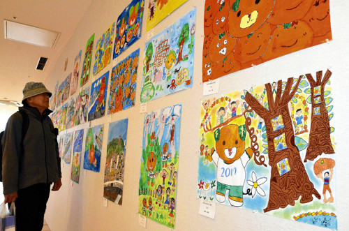 小中高校生を対象に、県が募集した「『みきゃん』で発信!愛媛の魅力絵画コンクール」への応募作品。応募作品約500点のうち、入賞した8点を含む計約70点が展示されている。