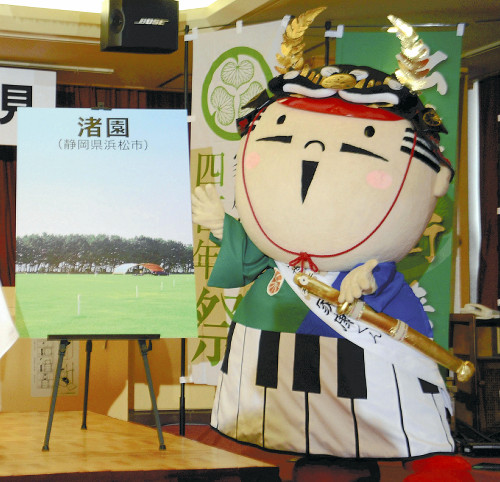 【開催地の渚園をアピールする家康くん(14日、東京都千代田区で)】