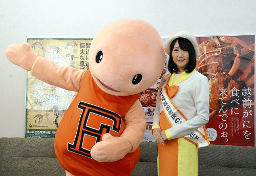 【県庁を訪れた福井県越前若狭の観光宣伝隊の女性とゆるキャラの「ティッチー」】