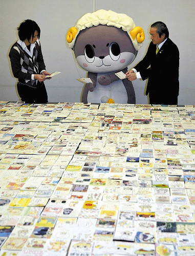 市によると、しんじょう君はホームページやツイッターなどで年賀状を送ってくれるよう呼びかけた。昨年の810通を大きく上回り、全47都道府県だけでなく台湾からも寄せられたという。県内からは最多の214通、次いで東京の149通だった。愛媛の「いまばりバリィさん」など各地のゆるキャラ仲間からも約40通届いた。