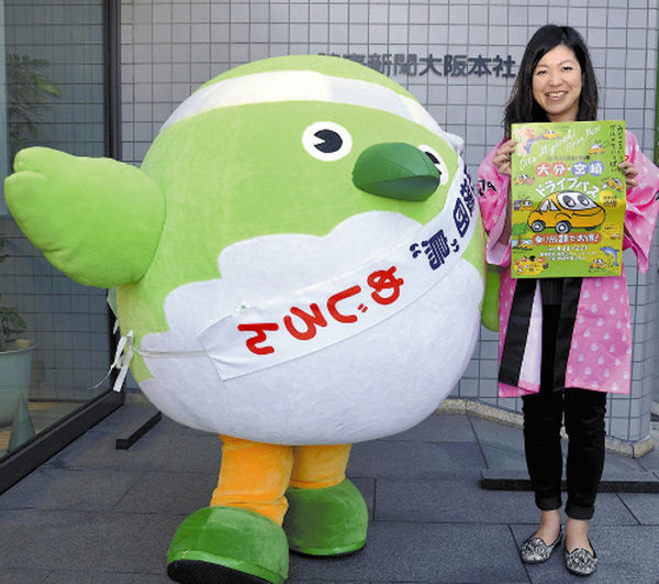 来春、東九州自動車道の大分、宮崎両県間が全面開通するのを前に、大分県のゆるキャラ「めじろん」らPR隊が27日、大阪市北区の読売新聞大阪本社を訪れ、高速道路周遊パスを利用した観光をアピールした。