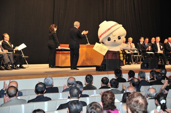 佐野商工会議所の会員大会が23日、浅沼町の市民文化会館大ホールで行われ、地域の産業の発展に特に功績があった方、創意工夫により商工業振興に力を尽くした方に贈られる“産業功労者”として、今回佐野市のブランドキャラクターである『さのまる』が表彰されました。