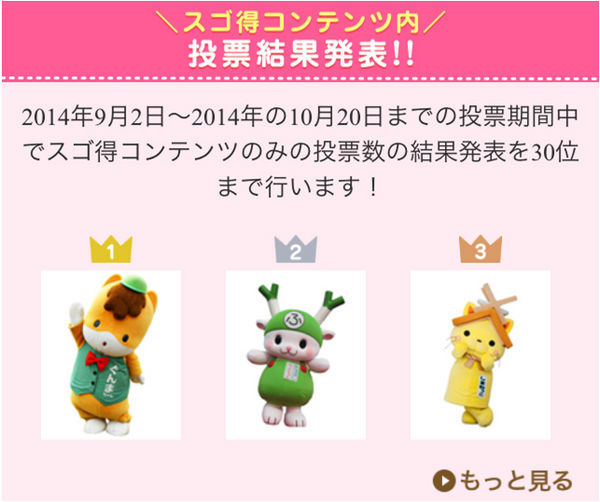 『ゆるキャラグランプリforスゴ得』のみの投票数の結果発表を30位まで行っています!