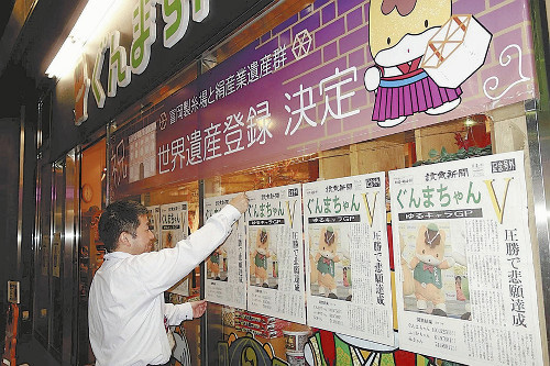 一方、東京・銀座のぐんまちゃん家ではショーウインドー一面に号外が貼られ、記念写真を撮る人も。夕方には優勝記念イベントも行われ、約100人がくすだまを割って祝った。4~16日は記念セールを開催し、一部商品を3割引きにしたり、1000円の買い物ごとに100円の補助券をプレゼントしたりする。