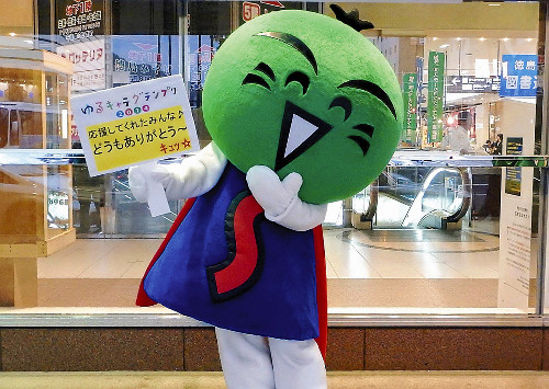 【20日に「最後のお願い」を終えたすだちくん(JR徳島駅前で)=県提供】
