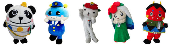 【左から「まもるンダ」、「キャッチくん」、「つばきねこ」、「ごとりん」、「バラモンちゃん」】