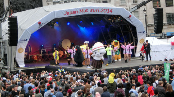 ロンドンのトラファルガー広場で27日、イギリス最大の日本文化を紹介する「ジャパン祭」と呼ばれるイベントが開かれました。今年で6回目となるイベントの目玉として「くまモン」などのゆるキャラたちが登場すると、会場から大きな歓声が上がりました。