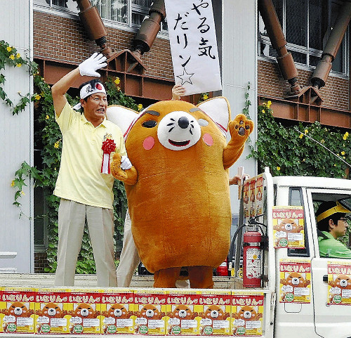 市役所の玄関ロビーで行われた出陣式では、「選対本部長」を務める山脇実市長らが応援演説。ほほを紅潮させたいなりんは、女性職員らでつくる応援団「いなりんず」のエールを受けてトラックの荷台に乗り込むと、「やる気だリン☆」のメッセージボードを掲げ、投票を呼びかけた。