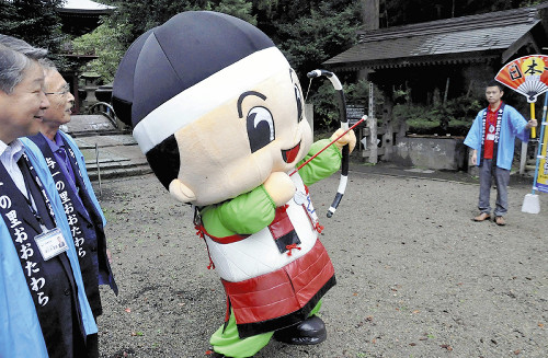 「ゆるキャラグランプリ2014」(読売新聞社協賛)の投票が9月2日に始まるのを前に、大田原市のキャラクター「与一くん」の必勝祈願・出陣式が28日、那須神社(同市南金丸)で行われた。昨年5位の与一くんは、「今年はぜったい日本一!!」を旗印にグランプリを目指す。