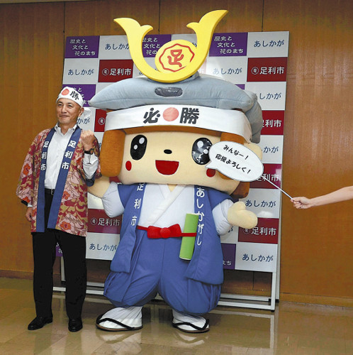 足利市のイメージキャラクター「たかうじ君」が20日、市役所で記者会見し、9月に投票が始まる「ゆるキャラグランプリ2014」への出馬を表明した=写真=。