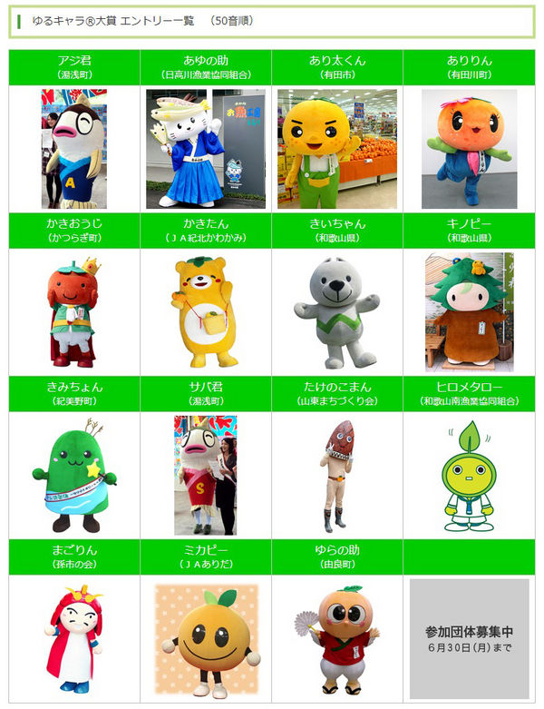 ゆるキャラ®の参加を希望される団体は、6月30日(月)まで募集中です。『サマーフェスティバル in 清水』実行委員会事務局(担当/道の駅しみず・前島/TEL 0737-25-1288)までぜひご連絡ください。みんなで和歌山を盛り上げましょう!(^0^)ノ