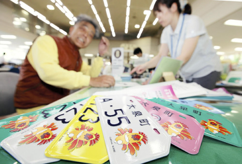 12日(日本時間13日)にはサッカー・ワールドカップ(W杯)ブラジル大会が開幕。事前に申し込んでいた自家用の原付きバイクのプレートを税務課の窓口で受け取った村山俊明町長は「W杯の勢いとぐんまちゃん人気の力を借りて町活性化につなげたい」と話していた。