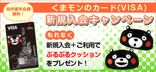 本キャンペーンは、「くまモンのカード(VISA)」新規入会し、入会月の翌々月までに合計20,000円以上ご利用の方に、もれなく、くまモンの「ぶるぶるクッション」をプレゼント。
