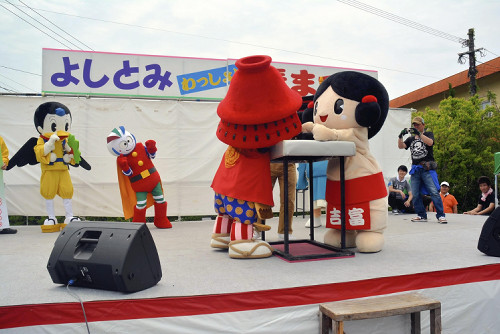 特設ステージでは、京築地区や大分県中津市など5自治体のマスコットキャラクターが腕相撲を競う「ゆるキャラアームレスリング」があり、同町の「かみんくん」が中津市の「くろかんくん」らを破って優勝。一般参加の腕相撲にも約50人が参加し、優勝者に同町の特産品が贈られた。