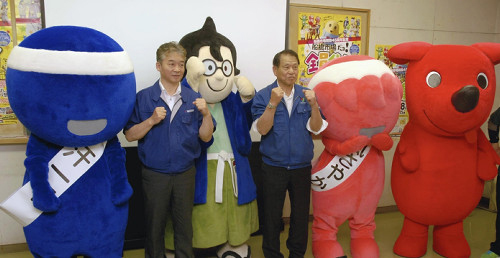 【記念イベントに参加する「チーバくん」(右端)らと成功に向けた意気込みを語る宮本実行委員長(左から2番目)ら】