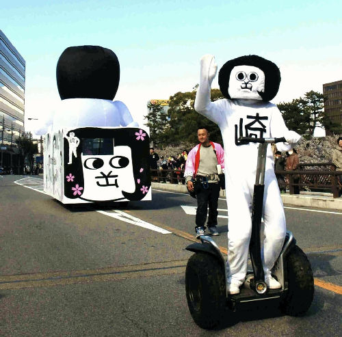 【セグウェイに乗り、沿道の市民に手を振るオカザえもん】