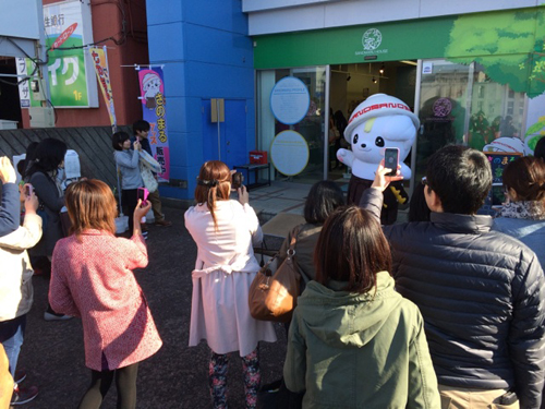 この日開店前には約100人が行列。訪れた人はさのまるに「おめでとう」と声を掛けて抱きつき、お目当ての商品を買い求めていた。
