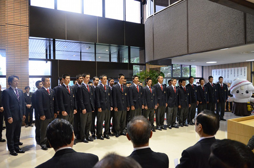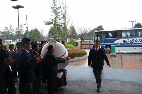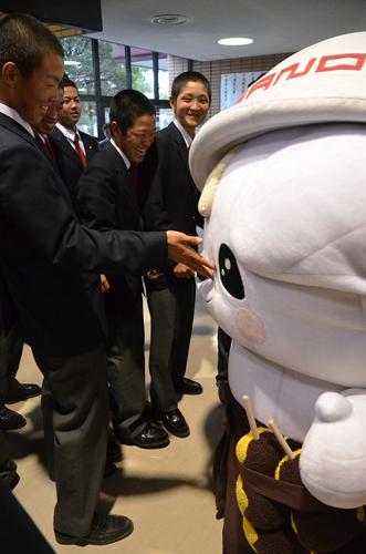 佐野市石塚町の同校では、同市の岡部正英市長や佐野市のブランドキャラクターの「さのまる」、控えの部員と教職員ら約100人が出迎え、盛大な拍手でナインの活躍をたたえた。