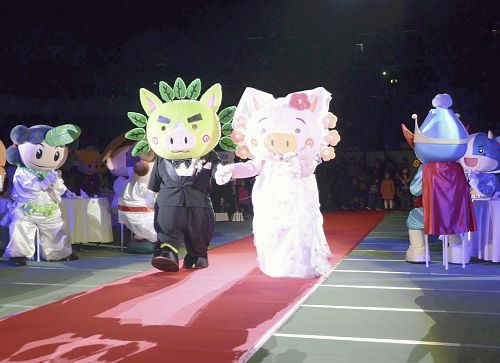 県のPRキャラクター「ぐりぶー」と「さくら」の結婚式が15日、鹿児島市永吉1の鹿児島アリーナで開かれた。県内各地のご当地ゆるキャラ約80体も勢ぞろいし、ダンスやマジックショーで盛り上げた。