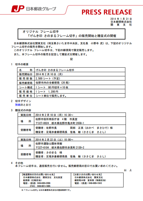時販売所を設置し「さのまるフレーム切手」を販売します。