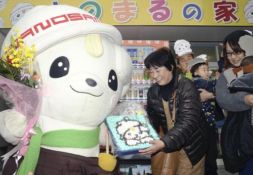 【グランプリを祝うプレゼントを市民から贈られるさのまる(栃木県佐野市の「さのまるの家」で)】