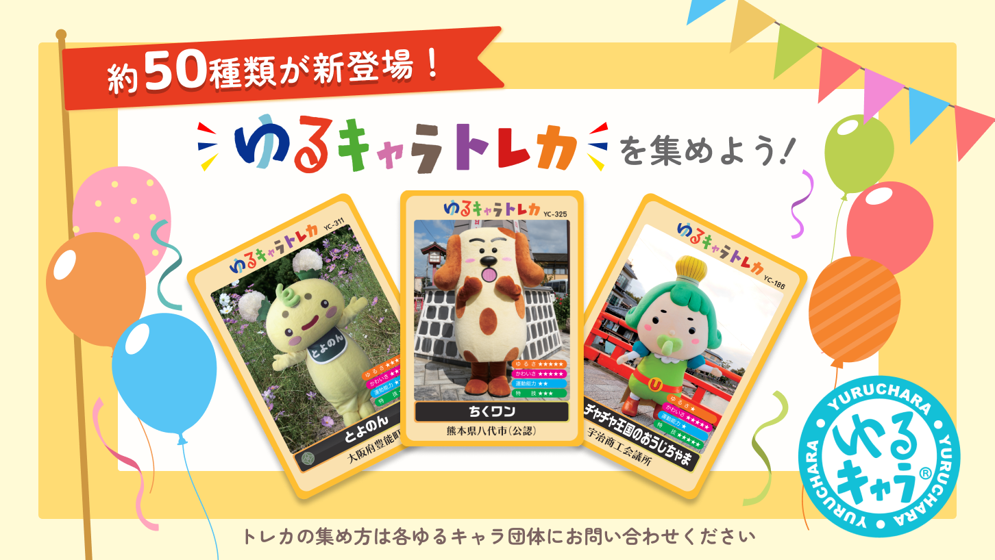 6年ぶりに復活したゆるキャラトレカ。 今回製作してくれたゆるキャラを一挙大公開! ぜひ集めてみてくださいね! 【今回トレカ製作してくれたゆるキャラ】 ※順不同(公開を承諾頂いた団体様分のみを記載しております) ※配布開始時期は、各団体により異なる可能性がございます。 ※トレカの集め方は各団体にお問合せ下さい。 ちくワン(ちくワンの公式HPからお問い合わせください) タノくん(岩手県田野畑村) はにぽん(埼玉県本庄市) 東亜坊や(東亜建設工業株式会社) オーランドさん(群馬県邑楽町) あかいわモモちゃん(岡山県赤磐市) たいみー( 南伊勢町観光協会) テクのすけ(デンソーテクノ株式会社) ブルくん・ミケちゃん(近鉄生駒ケーブル) たまーりん(さいたまスーパーアリーナ) ちぃたん(AKIBA観光協議会) Hooちゃん(株式会社山野楽器) うなぽん (静岡県湖西市) オケちゃん((一社)桶川市観光協会) のまっキー((一社)あいち美浜町観光協会) Chiro 刺郎(Mascottist Academy Co. Ltd) まいたん(株式会社マイタウン) るーたん(株式会社セキチュー) にゃがのはら(群馬県長野原町) てっくちゃん (長菱ハイテック株式会社) えきにゃか・たいむちゅ(Time’s Place(タイムズプレイス)) べるーにゃ(株式会社ベルーナ) 自動車リサイクル博士(公益財団法人自動車リサイクル促進センター) アオキノコちゃん(青木村) かいちゃん&つぶちゃん(埼玉県三郷市) たなみん(田辺三菱製薬) とよのん(大阪府豊能町) チャチャ王国のおうじちゃま(宇治商工会議所) キャピクル(JU東京/東京都中古自動車販売商工組合) くもびぃ(株式会社KINTO) ネコかっぱアイちゃん(アイオンドルフィンズ) ひなちゃん(埼玉県鴻巣市) REITO(れいと)(ハイアール) かきたん(JAわかやま 紀北地域本部) ホロル(茨城県東茨城郡城里町) つちまる(茨城県土浦市) トライくん(東大阪市) おきよめっち(長野県天龍村) ビラッキー(北海道平取町) チョコえもん(宮城県川崎町) たび丸(滋賀県草津市) 赤ちゃん太陽くん(千葉県長生村) 【ご当地マスコットキャラクター(ゆるキャラ)をお持ちの団体様へ】