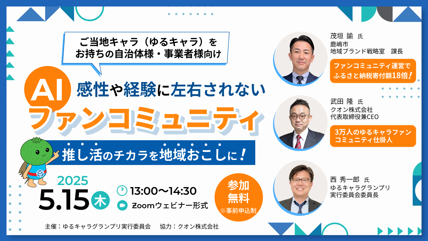 ゆるキャラ団体様の活動に何かお役立て頂ける情報発信をしたいとの想いから、 この度、弊委員会主催でオンラインでの特別セミナーを開催致します。 テーマは「感性や経験に左右されないAIファンコミュニティ」。 地域おこしの手段として定着しつつある、ご当地マスコットキャラ(ゆるキャラ)の運用。 そのSNS運営やファンづくりなどで直面する課題を解決する手法として、生成AIを活用した ファンコミュニティの可能性を取り上げます。ぜひ一度耳を傾けて頂けましたら幸いです。 多くの皆様のご参加をお待ちしております。