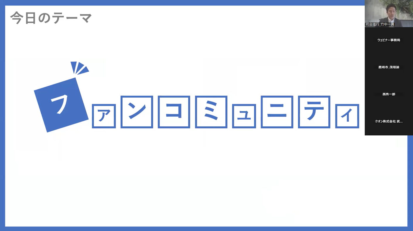 「感性や経験に左右されないAIファンコミュニティ」に関するオンライン特別セミナーを開催しました。 約100名に及ぶ自治体様・事業者様にご参加頂きまして、誠にありがとうございました。 これからのファンコミュニティの形成・強化に向けて、お役立て頂けますと幸いです。 今後も当委員会では、ご当地マスコットキャラクター(ゆるキャラ)を通じた活動をご支援するため、 様々なセミナーや企画を予定しております。多くの方のご参加をお待ちしております。 各種情報は本ウェブサイトでのご案内のほか、ゆるキャラ団体様向けメールマガジンでも配信しております。 人事異動や担当変更等により、登録時から宛先が変更となっている場合には、お問合せ窓口までメールにてお知らせください。 お問合せ先:ゆるキャラグランプリ実行委員会 support@yurugp.jp 【セミナーの様子】